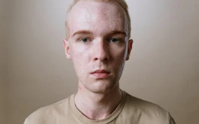 • A close-up portrait of a blonde man with acne portraying a candid expression and natural look.