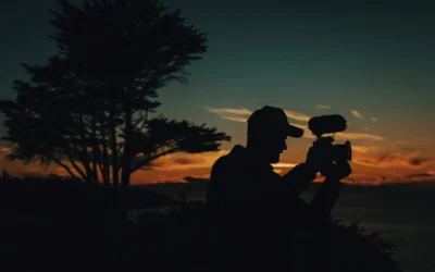 • A silhouette of a man with a camera at sunset