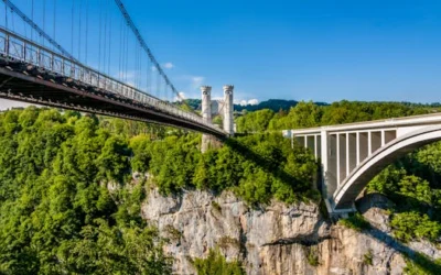 • Aerial view of dual bridges spanning a lush green canyon, showcasing architectural contrast.