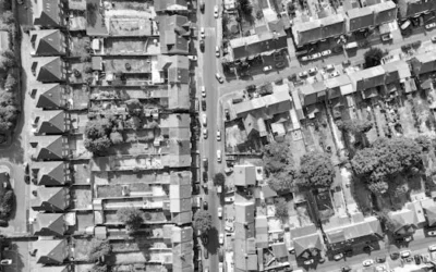 • A black and white aerial cityscape capturing the dense housing pattern in Luton, England.