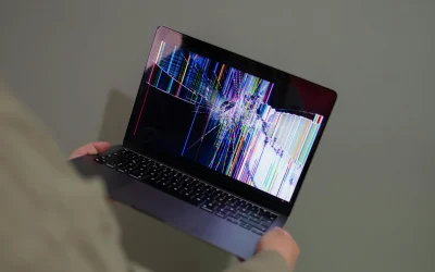 • A broken laptop screen displayed with colorful glitch being held by a person.